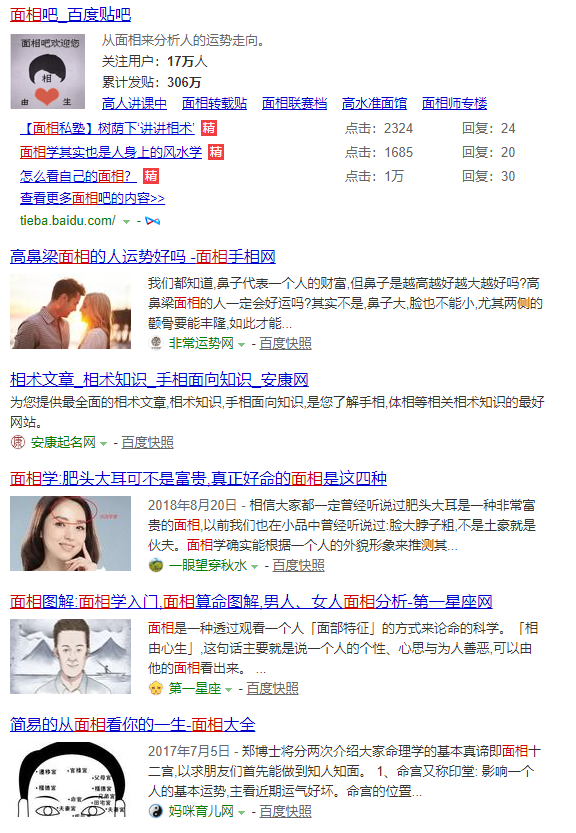 在百度里搜“面相”,也会推送很多关于命理测算的相关网页。