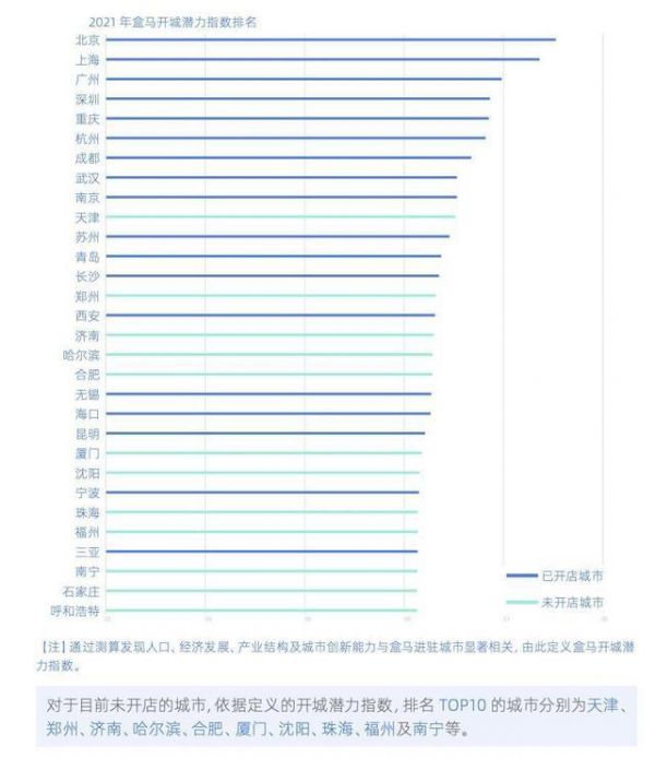 贝壳研究院通过分析盒马的进驻城市,发现开城与人口、经济发展、产业结构和城市创新能力等多种因素相关。因此推测未来入驻排名前十的城市为天津、郑州、济南、哈尔滨、合肥、厦门、沈阳、珠海、福州及南宁等。